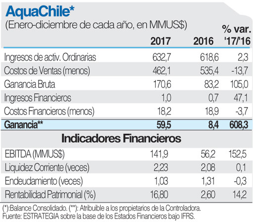 AquaChile registró en 2017 una utilidad atribuíble a los controladores de US$ 59,5 millones, lo que implica un crecimiento de 7 veces respecto de la ganancia de US$ 8,4 millones del año 2016. Estos resultados se explican principalmente por una disminución en el costo de ventas del Salmón Atlántico, Salmón del Pacífico y Tilapia; y los buenos niveles de precios de venta durante el período para todas las variedades de salmones y trucha.