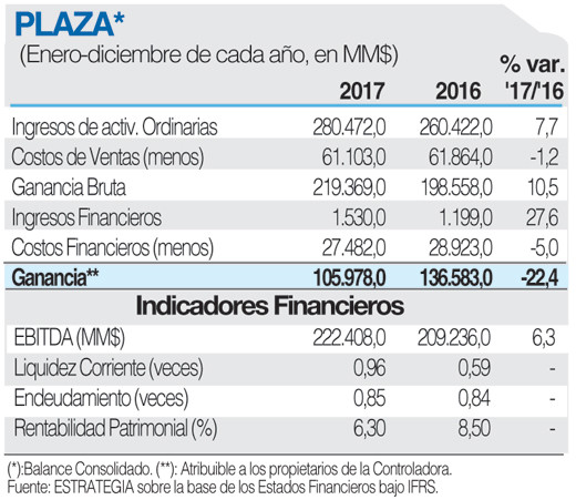 A diciembre 2017 la operadora de malls y centros comerciales Plaza S.A. alcanzó una ganancia atribuible a los propietarios de la controladora de $ 105.978 millones, una baja de 22% respecto a las utilidades anotadas a diciembre 2016.