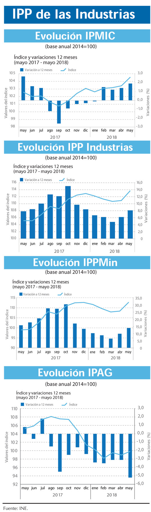El Índice de Precios de Productor (IPP) de Industrias (agregación de los sectores minería, manufactura y electricidad, gas y agua) presentó un aumento anual de 8,1% en mayo, acumulando un ascenso de 0,7% al quinto mes del año.