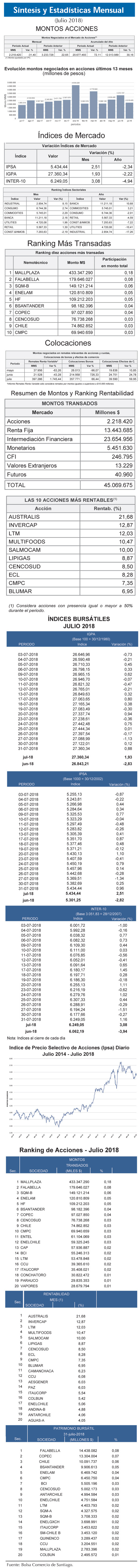 En el séptimo mes del año los principales índices IPSA, IGPA e INTER-10 revirtieron la tendencia negativa mostrada en el primer semestre, acumulando ganancias en el mes de 2,51%, 1,93% y 3,08%, respectivamente.