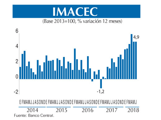 “El mes registró igual cantidad de días hábiles que junio de 2017. El Imacec minero aumentó 3,7%, mientras que el Imacec no minero lo hizo en 5%. Este último se vio incidido por el desempeño de las actividades de comercio e industria manufacturera”, apuntó la entidad. En términos desestacionalizados, y con respecto al mes anterior, constató, el Imacec minero disminuyó 2,7% y el no minero se expandió 0,2%.