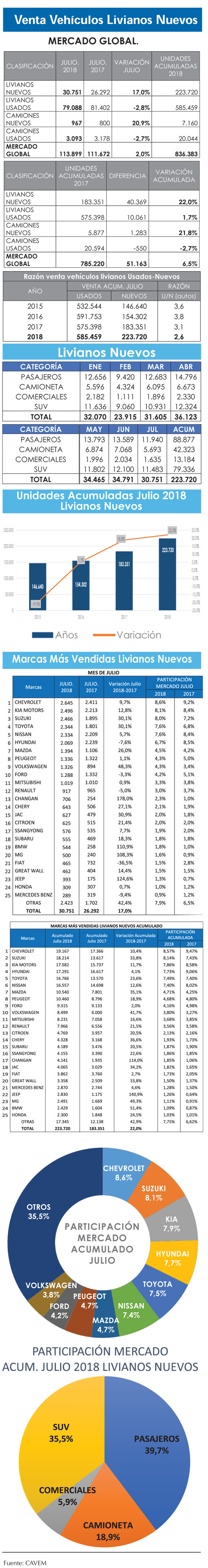 Dentro de las ventas por marcas, se destaca a CHEVROLET como el líder tanto del mes de julio como en el acumulado. En julio se comercializaron 2.645 unidades que corresponden al 8,6% del mercado, seguido por KIA que alcanzó las 2.496 unidades. En el acumulado CHEVROLET registró 19.167 unidades que corresponde al 8,57% del mercado de livianos nuevos, lo sigue en el segundo lugar SUZUKI con 18.214 unidades con un 8,14% de la participación a nivel país.