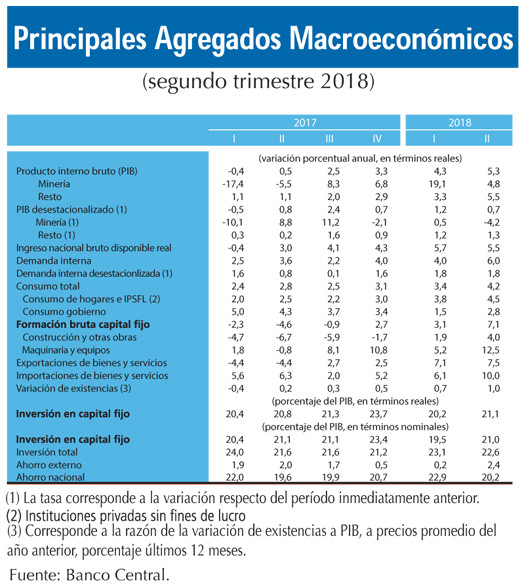 “Con dos días hábiles más que el segundo trimestre del año 2017, el efecto calendario resultó igual a 0,2 puntos porcentuales. Desde la perspectiva del origen, se observaron incrementos en todas las actividades, destacando en términos de incidencia la industria manufacturera y comercio y, en menor medida, servicios personales y empresariales. En tanto, las actividades agropecuario-silvícola y pesca destacaron por su dinamismo”, consignó el ente emisor.