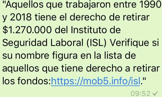 Mediante un comunicado el Instituto de Seguridad Laboral del Ministerio del Trabajo alerta que han detectado que el nombre del Instituto de Seguridad Laboral está siendo utilizado de forma maliciosa, a través de un mensaje enviado por WhatsApp, en el que se indica que existe un beneficio de devolución de dinero para los trabajadores que hayan ejercido funciones en el período 1990 a 2018, y les solicita ingresar a un link para verificar si es beneficiario de esta devolución.
