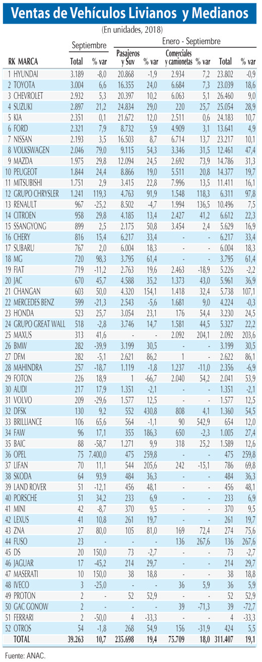 Las marcas que lideraron las colocaciones en el noveno mes del año son Hyundai y Toyota con 3.189 y 3.004 unidades, respectivamente. Mientras, en el acumulado del año encabezan las ventas Chevrolet (26.460 unidades) y Suzuki (25.024 unidades).