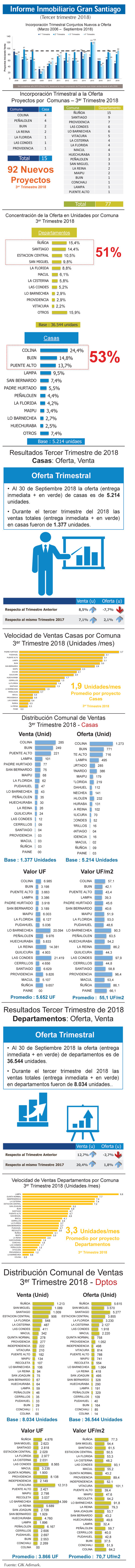 De acuerdo al Informe de Oferta Inmobiliaria de GfK, durante el tercer trimestre del 2018, se vendieron 9.411 unidades y 38,8 MUF (entrega inmediata +en verde + en blanco). En términos de unidades, esto representa un incremento de 12% con respecto al trimestre anterior y de 18,2% comparando el mismo periodo de 2017.