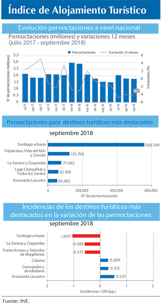 De acuerdo con la Encuesta Mensual de Alojamiento Turístico (EMAT) publicada este lunes por el Instituto Nacional de Estadísticas (INE), en septiembre de 2018 hubo un total de 1.769.220 pernoctaciones en el país, disminuyendo 4,3% en doce meses y acumulando un decrecimiento de 2,4% en lo que va del año. Este resultado se explicó por una contracción interanual de las pernoctaciones de pasajeros residentes en el extranjero (-15,0%). Por su parte, las pernoctaciones de pasajeros residentes en Chile se incrementaron en doce meses (1,8%).