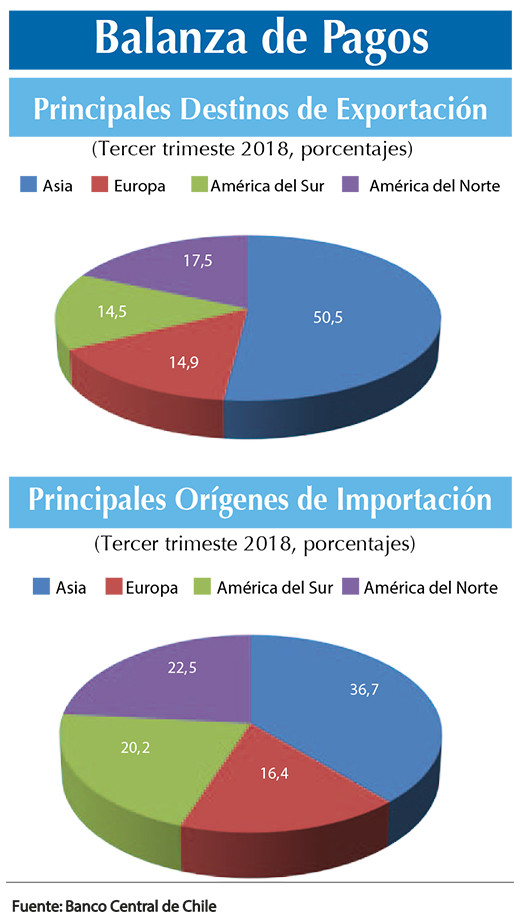 Por zona geográfica, Asia destacó como el principal destino de las exportaciones, representando 50,5% de éstas; el resto se destinó a América del Norte, Europa y América del Sur. Respecto de igual trimestre del año anterior, Asia fue el único destino que creció (6,2%), en tanto, América del Sur, Europa y América del Norte bajaron 13,2%; 4,6 y 3,3%, respectivamente.