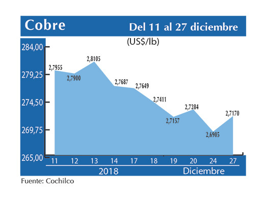 Un ascenso de 1% experimentó este jueves la cotización del cobre en la Bolsa de Metales de Londres (BML). La materia prima cerró en US$ 2,717 la libra ante las esperanzas de que Estados Unidos (EE.UU.) y China concreten una ronda de negociaciones en enero próximo con miras a destrabar la disputa comercial que protagonizan desde hace meses. Autoridades de Pekín aseguran que está planeado un encuentro bilateral para tratar la materia el mes entrante, “pese a que el lado estadounidense está en el período de vacaciones navideñas”, dijo Gao Feng, portavoz del Ministerio de Comercio. Según consignó, los equipos económicos y comerciales de las dos potencias han mantenido una estrecha comunicación, y las consultas están progresando de manera ordenada según lo programado”. Sería el primer encuentro cara a cara desde que el presidente Donald Trump y su homólogo chino, Xi Jinping, se reunieron en Buenos Aires el 1 de diciembre.