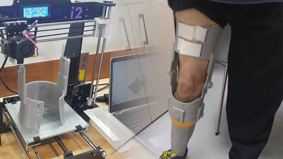 La primera prótesis que utilizó Víctor fue elaborada por el docente USS a partir de termoplástico y madera, “instrumento funcional e importante para que no quedara postrado, pero poco estético y de materiales caros”, dijo López.