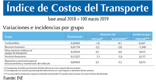 En marzo de 2019, según informó esta mañana el Instituto Nacional de Estadísticas (INE), el Índice de Costos del Transporte (ICT) anotó una disminución mensual de 1,5%, acumulando -3,9% en lo que va del año.