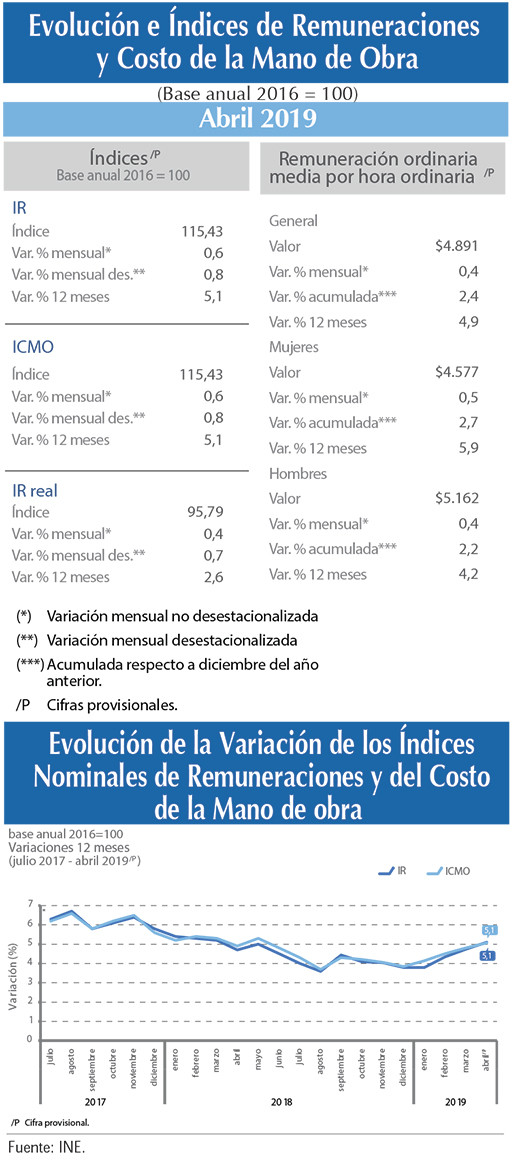 En abril de 2019, los Índices Nominales de Remuneraciones (IR) y del Costo de la Mano de Obra (ICMO) registraron incrementos en doce meses de 5,1%. Por sector económico, comercio, industria manufacturera, construcción y servicios administrativos y de apoyo anotaron las mayores incidencias anuales positivas en ambos indicadores.