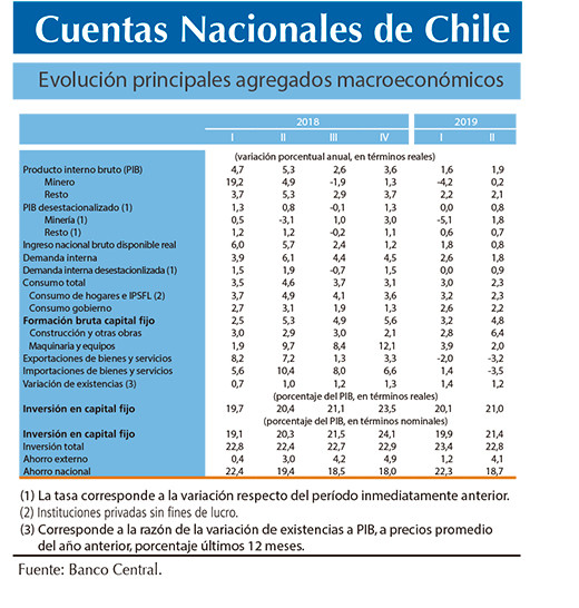 La economía chilena creció 1,9% anual en el segundo trimestre. El Banco Central lo informó este lunes a través del informe Cuentas Nacionales. Desde la perspectiva del gasto, consigna el reporte, el PIB creció impulsado por una demanda interna expandiéndose a una tasa anual de 1,8%. El consumo de los hogares aumentó en el período, aunque a un ritmo menor que el trimestre anterior y la FBCF incrementó su dinamismo alcanzando una tasa de 4,8%. Por otro lado, se observaron disminuciones tanto en las exportaciones como en las importaciones, con un efecto neto positivo en el PIB.