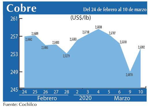 Un rebote de 2,10% experimentó este martes el precio del cobre en la Bolsa de Metales de Londres (BML). La materia prima se cotizó en US$ 2,539 la libra desde los mínimos de dos años tocados en la víspera, mientras caían los casos de coronavirus en China y países de todo el mundo se preparaban para inyectar estímulo en sus economías.