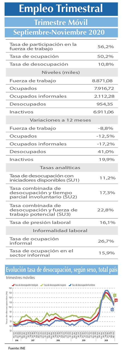 De acuerdo a la información recolectada en la Encuesta Nacional de Empleo (ENE), que elabora el Instituto Nacional de Estadísticas (INE), en el trimestre septiembre-noviembre la tasa de desocupación alcanzó 10,8%, registrando un ascenso de 3,8 pp. en doce meses, producto de las reducciones de la fuerza de trabajo en 8,8% y de los ocupados en 12,5%. Por su parte, los desocupados aumentaron 41,0%, incididos únicamente por los cesantes (49,3%).