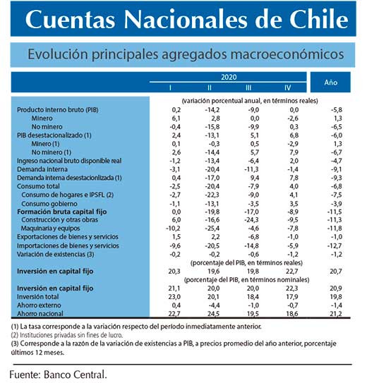 “Considerando los desafíos que la crisis sanitaria ha impuesto sobre la recolección de datos básicos, el Banco Central de Chile ha hecho esfuerzos adicionales con sus proveedores de información para minimizar el impacto en la calidad de las estadísticas. Sin embargo, es importante señalar que las cifras publicadas en esta oportunidad podrían estar sujetas a revisiones mayores que las registradas históricamente, las cuales serán difundidas de acuerdo al calendario de publicaciones y revisiones de Cuentas Nacionales disponible en la página web institucional”, apuntó el ente emisor.