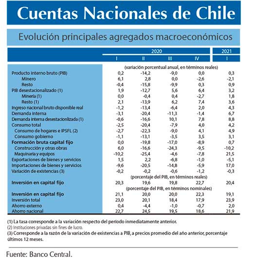 Considerando los desafíos que la crisis sanitaria ha impuesto sobre la recolección de datos básicos, el Banco Central de Chile ha hecho esfuerzos adicionales con sus proveedores de información para minimizar el impacto en la calidad de las estadísticas. Sin embargo, es importante señalar que las cifras publicadas en esta oportunidad podrían estar sujetas a revisiones mayores que las registradas históricamente, las cuales serán difundidas de acuerdo al calendario de publicaciones y revisiones de Cuentas Nacionales disponible en la página web institucional.