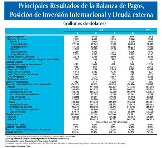 El resultado trimestral se explica por las utilidades devengadas de la inversión extranjera en Chile y el déficit de la balanza comercial de servicios, que fue en parte compensado por el superávit de la balanza comercial de bienes. En ese plano, las exportaciones reportaron un alza anual de 27,3% hasta los US$ 21.897 millones mientras que las importaciones se elevaron en un 27% en doce meses hasta los US$17.940 millones.