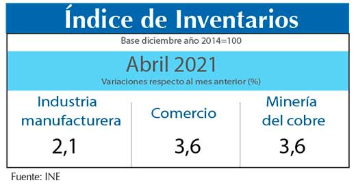 En tanto, el Índice de Inventarios de la Industria Manufacturera (IIMan) aumentó 2,1% en abril de 2021 (en comparación con el mes anterior) incidido, principalmente, por la división Elaboración de Bebidas Alcohólicas y no Alcohólicas. Dentro de ésta, destacó el aumento de los inventarios clasificados como productos terminados, cuya acumulación se explicó, en mayor medida, por factores estacionales asociados a procesos productivos en algunas empresas del rubro.