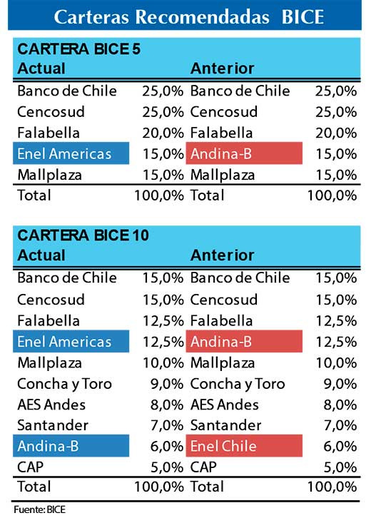 La entidad financiera apuntó que “estamos realizando cambios en nuestras carteras recomendadas, destacando el ingreso de Enel Américas, la disminución de ponderación de Andina-B y la salida de Enel Chi le. Estamos (1) incluyendo a Enel Américas en la 4ta posición de nuestra cartera BI CE 5, destacando su atractiva diversificación regional, positivos resultados de corto plazo, sólida posición financiera y alto peso en los índices. A nivel táctico, el ingreso de Enel Amé ricas responde a que esperamos un aumento importante en la volatilidad de la bolsa chile na en el corto plazo ante la incertidumbre respecto de la lectura que se haga de los resulta dos de las elecciones presidenciales y parlamentarias. En ese contexto, creemos que es necesario hacer una gestión activa de los principales riesgos, por lo que Enel Américas pro vee una mayor diversificación fuera de Chile. En tanto, estamos (2) disminuyendo exposi ción a Andina-B que baja desde la 4ta posición de nuestra cartera BICE 5 a la 9na posición de nuestra cartera BICE 10, luego de un 1,9% de exceso de retorno sobre el IPSA desde su incorporación (03-03-2021). Por último, estamos retirando Enel Chile para mantener el peso relativo del sector eléctrico, donde ya tenemos una alta exposición a AES Andes. En Enel Chile decidimos acotar pérdidas, a pesar de que seguimos viendo un importante atrac tivo a nivel de fundamentos y valorización, pero creemos que la compañía no tiene muchos catalizadores en el corto plazo."