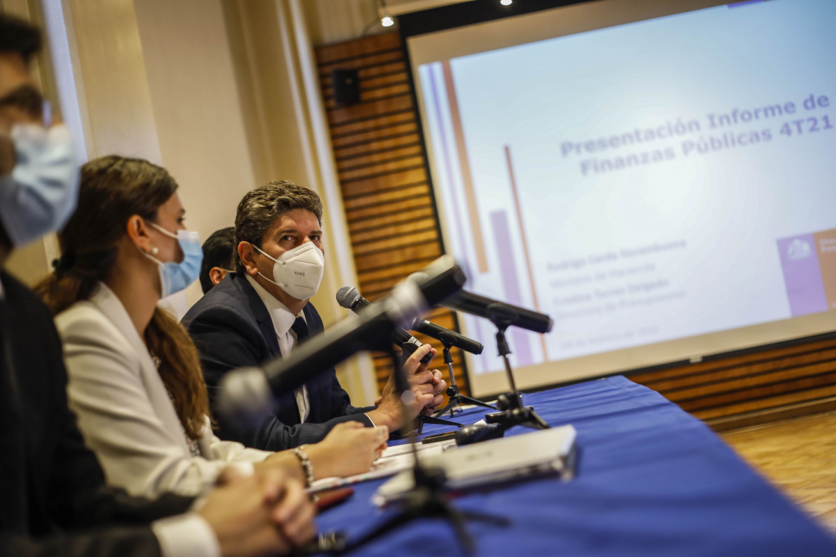 El Ministro de Hacienda, Rodrigo Cerda, y la Directora de Presupuestos, Cristina Torres, presentaron el Informe de Finanzas Públicas (IFP) del cuarto trimestre de 2021, junto al Coordinador Macroeconómico y de Finanzas Internacionales de Hacienda, Cristóbal Gamboni, y al Jefe de Estudios de Dipres, Mauricio Carrasco. Este informe describe el cierre preliminar del escenario fiscal de 2021, a partir de la actualización del escenario macroeconómico y del cierre de la ejecución presupuestaria, actualiza las principales cifras macroeconómicas y fiscales del presente año, y delinea el escenario de mediano plazo (2023-2026).