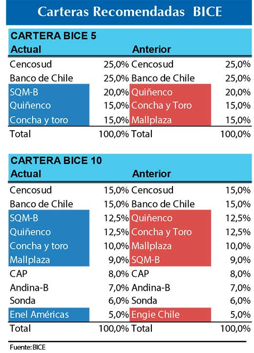En este contexto, la entidad privada indicó que “estamos realizando cambios en nuestras carteras recomendadas, destacando el aumento en ponderación de SQM en remplazo de Mall Plaza y el reingreso de Enel Américas en reemplazo de Engie Chile. Estamos aumentando exposición a SQM-B, aumentando su ponderación desde la 6ta posición en nuestra cartera BICE 10 a la 3ra posición de nuestra car tera BICE 5. Destacamos la atractiva dinámica de resultados de corto plazo, donde la compañía liderará el crecimiento en utilidades de las empresas IPSA en un contexto en el que tanto el segmento Litio como el de Fertilizantes han tenido fuertes mejoras en perspectivas, que llevarían a revisar nuevamente las estimaciones al alza. Según las actuales estimaciones de mercado, la compañía se encontraría transando en niveles cercanos a 7,0x EV/ EBITDA lo que implica un alto descuento en valorización respecto a promedios históricos. Además, creemos que la corrección observada el último mes en un contexto de correcciones globales otorga un mejor punto de entrada en la compañía. En tanto, estamos disminuyendo exposición en Mall Plaza que baja a la 6ta posición de nuestra cartera BICE 10.”