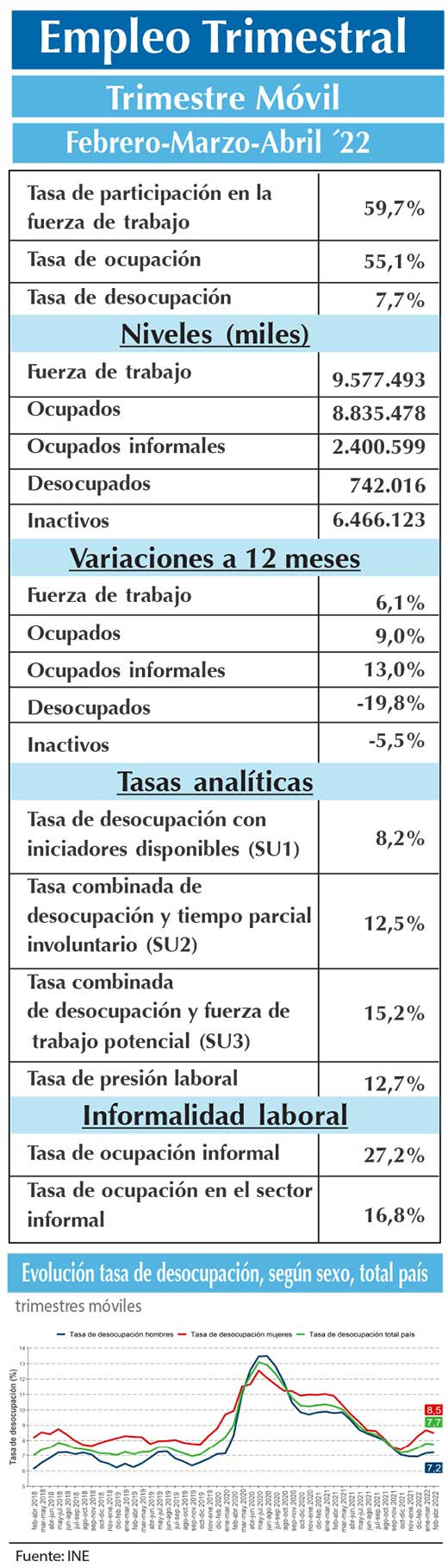 En 7,7% se ubicó la tasa de desocupación en Chile durante el trimestre móvil febrero-abril de 2022, de acuerdo con la información registrada en la Encuesta Nacional de Empleo (ENE) que elabora el Instituto Nacional de Estadísticas de Chile (INE). La cifra significó un descenso de 2,5 puntos porcentuales (pp.) en doce meses, dado que el alza de la fuerza de trabajo (6,1%) fue menor a la presentada por las personas ocupadas (9,0%). Por su parte, las personas desocupadas disminuyeron 19,8%, incididas por quienes se encontraban cesantes (-21,1%) y por aquellas que buscan trabajo por primera vez (-7,3%).