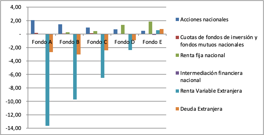A su vez, la rentabilidad de los fondos de pensiones tipos A, B y C obedece, en parte, al retorno negativo que presentaron las inversiones en instrumentos extranjeros. Dicho retorno fue parcialmente compensado por la rentabilidad positiva que presentaron las inversiones en acciones locales. Al respecto, tómese como referencia la rentabilidad en pesos del índice MSCI mundial, con una caída de 4,83%, y el retorno mensual de los títulos accionarios locales medido por el IPSA, que presentó un alza de 12,37% durante mayo.