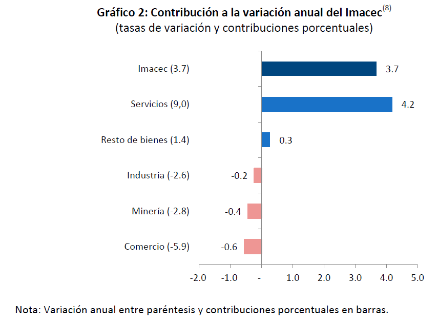 El aumento del Imacec estuvo incidido principalmente por las actividades de servicios. En tanto, el comercio y la producción de bienes cayeron.