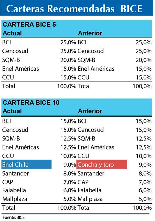 El Departamento de Estudios de BICE Inversiones publicó un nuevo informe con la actualización de las carteras de 5 y 10 acciones recomendadas para este mes. “Estamos realizando cambios en nuestras carteras recomendadas, destacando el ingreso de Enel Chile en reemplazo de Concha y Toro en nuestra cartera BICE 10, apuntó la entidad.