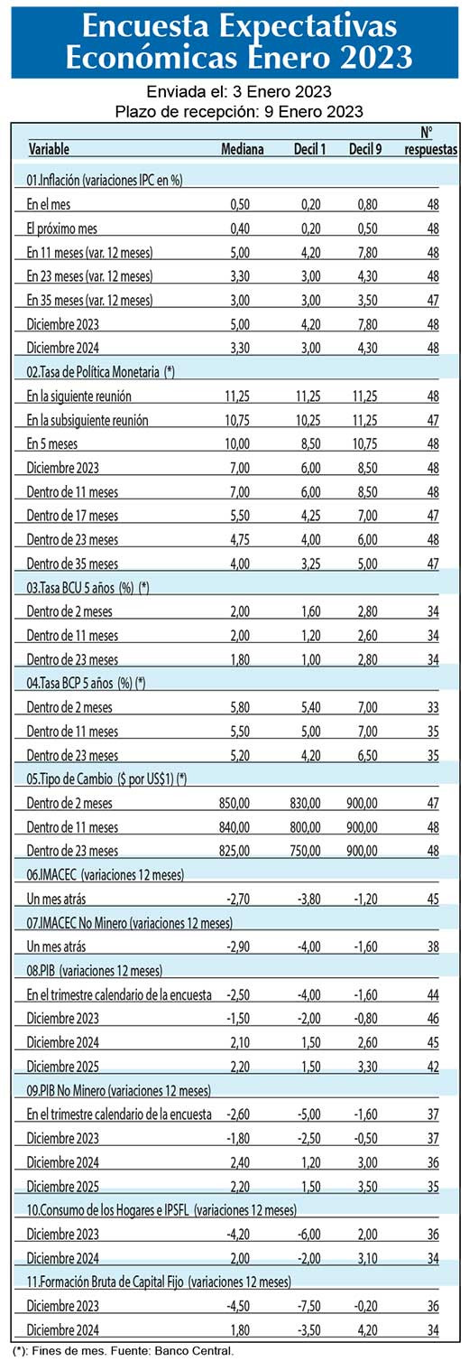 Un ascenso de 0,5% registraría el IPC en enero, de acuerdo a la Encuesta de Expectativas Económicas (EEE) del Banco Central. El sondeo, publicado esta mañana, señala que la inflación reportaría un alza de 0,4% en febrero mientras que dentro de doce meses lo haría en un 5% anual y en 24 meses en un 3,3% anual.