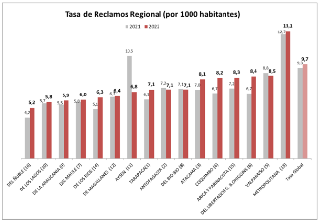 Al analizar por regiones, la Región Metropolitana fue la que concentró la tasa más alta, con 13,1 reclamos por cada 1.000 habitantes. Por su parte, Ñuble presentó la tasa más baja, con 5,2 reclamos por cada 1.000 habitantes.