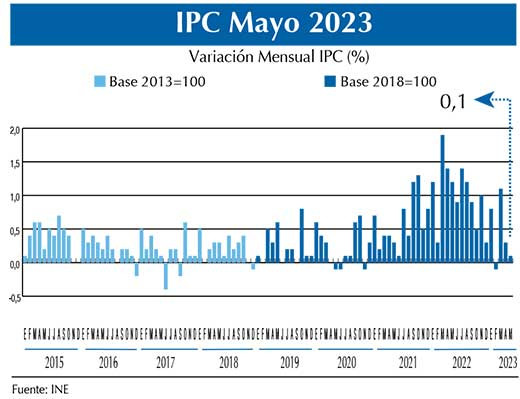 En mayo de 2023 el Indice de Precios al Consumidor (IPC) anotó una variación mensual de 0,1%, acumulando 2,3% en lo que va del año y un alza a doce meses de 8,7%, informó esta mañana el Instituto Nacional de Estadísticas (INE).