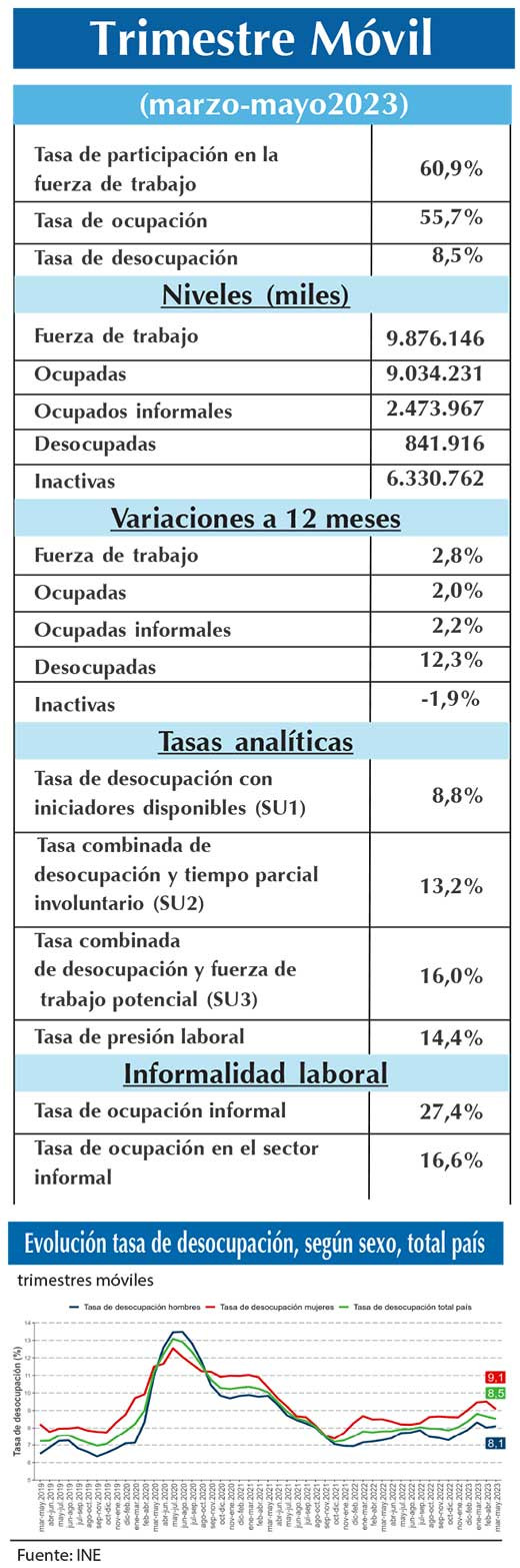 En 8,5% se ubicó la tasa de desocupación en Chile durante el trimestre móvil marzo-mayo de 2023, de acuerdo con la información registrada en la Encuesta Nacional de Empleo (ENE) que elabora el Instituto Nacional de Estadísticas de Chile (INE). La cifra significó un aumento de 0,7 puntos porcentuales (pp.) en doce meses (séptimo incremento anual después de continuas disminuciones desde marzo-mayo 2021), dado que el alza de la fuerza de trabajo (2,8%) fue mayor a la presentada por las personas ocupadas (2,0%). Por su parte, las personas desocupadas se expandieron 12,3%, incididas por quienes se encontraban cesantes (15,0%).