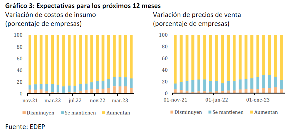 Por el lado de las expectativas, el porcentaje de empresas que espera un aumento en sus costos de insumo durante los próximos 12 meses sube levemente. Del mismo modo, las empresas que esperan que sus precios de venta aumenten en el mismo periodo de referencia se incrementa, lo que es consistente con un escenario esperado de mayor dinamismo en la actividad.