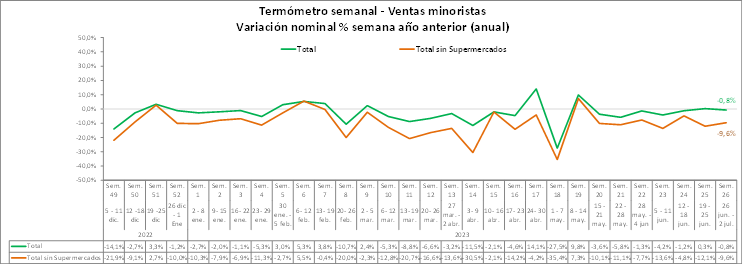 De esta manera, las semanas del mes de junio promediaron una baja nominal de 1,5% en las ventas del retail, menor a la caída de mayo. Sin embargo, sin considerar supermercados se evidencia un descenso nominal de 9,6%.