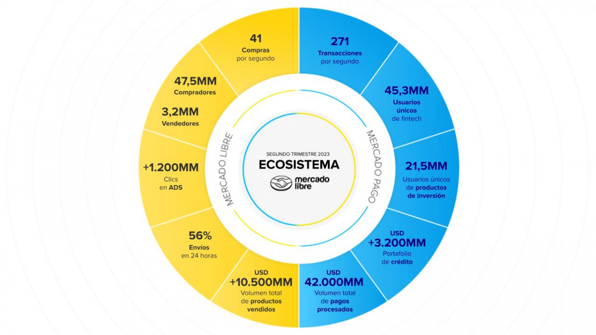Los ingresos netos del negocio de e-commerce aumentaron 64,8% interanual en moneda constante, ascendió a USD 1,9 mil millones, como resultado del rápido crecimiento del volumen de ventas en el periodo, cuando el total de compradores únicos alcanzó los 47,6 millones, un repunte del 16,6%. Los ingresos netos de fintech alcanzaron los USD 1,5 mil millones, un crecimiento del 48,4% en moneda local. Durante el segundo trimestre, Mercado Pago sobrepasó los 45,3 millones de usuarios activos, un aumento del 18,3%: solo en los últimos 12 meses, se agregaron más de 7,1 millones de nuevos usuarios.