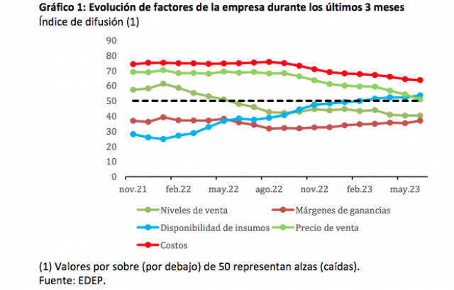 Resultados principales La evolución de los factores de las empresas indica un escenario en que sus precios de venta no se han modificado en el último trimestre móvil. Los niveles de venta mantienen un ritmo de deterioro similar al del reporte anterior. La disponibilidad de insumos continuó mejorando, con costos que siguen en niveles elevados, pero en una progresiva tendencia de disminución (Gráfico 1).