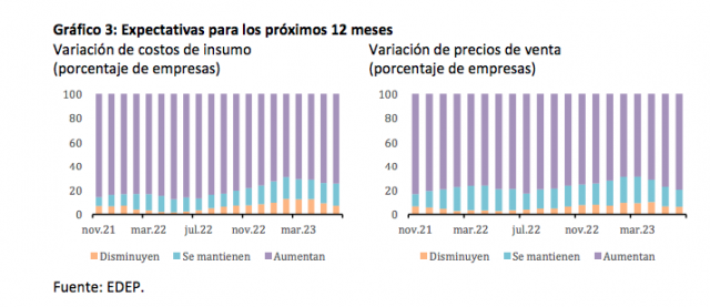 Por el lado de las expectativas, el porcentaje de empresas que espera un incremento en el costo de sus insumos durante los próximos 12 meses sube levemente. Asimismo, el porcentaje de empresas que prevén que sus precios de venta aumenten en el mismo período de referencia vuelve a subir1 (Gráfico 3).