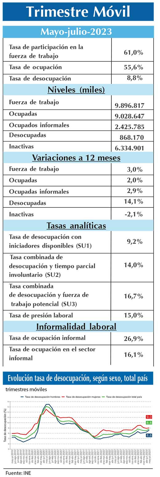 En 8,8% se ubicó la tasa de desocupación en Chile durante el trimestre móvil mayo-julio de 2023, de acuerdo con la información registrada en la Encuesta Nacional de Empleo (ENE) que elabora el Instituto Nacional de Estadísticas de Chile (INE). La cifra significó un aumento de 0,9 puntos porcentuales (pp.) en doce meses (noveno incremento anual después de continuas disminuciones desde marzo-mayo 2021). Esto, debido a que el alza de la fuerza de trabajo (3,0%) fue mayor a la presentada por las personas ocupadas (2,0%). Por su parte, las personas desocupadas se expandieron 14,1% en un año, incididas por quienes se encontraban cesantes (14,7%) y por quienes buscan trabajo por primera vez (7,8%).