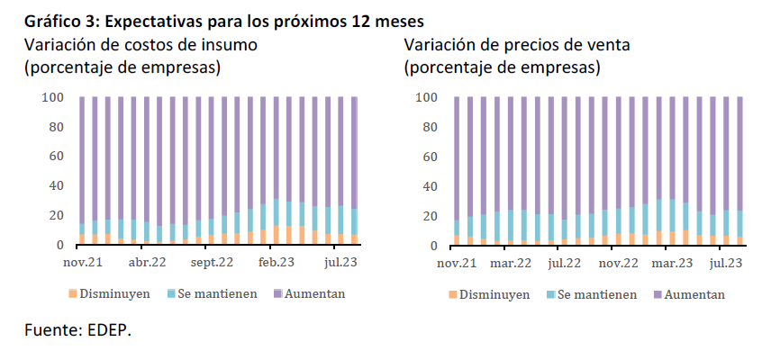 Por el lado de las expectativas, el porcentaje de empresas que espera un incremento en el costo de sus insumos durante los próximos 12 meses aumenta levemente. Asimismo, el porcentaje de empresas que prevé que sus precios de venta aumenten en el mismo período de referencia se mantiene.