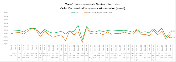 De esta manera, en términos reales, la baja anual promedio de las semanas de septiembre es de 9,6% y de 16,2% sin considerar supermercados, caídas mayores a las registradas en agosto, con una contracción promedio de 14,4% real en tiendas especializadas y una caída real anual de 17,3% en las no especializadas. Por su parte, supermercados refleja una baja real de 2,2% en el promedio semanal del noveno mes del año.