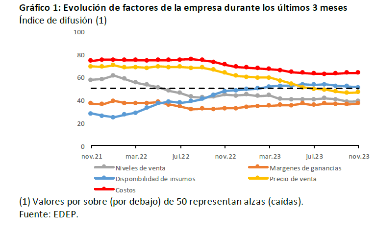 La evolución de los factores de las empresas muestra un escenario en que sus precios de venta disminuyen, pero a menor velocidad que en el trimestre anterior. En tanto, los niveles de venta y márgenes de ganancia se mantienen cayendo a un ritmo similar. Por su parte, la disponibilidad de insumos no presenta variaciones, mientras que la velocidad de aumento de los costos se estabiliza.