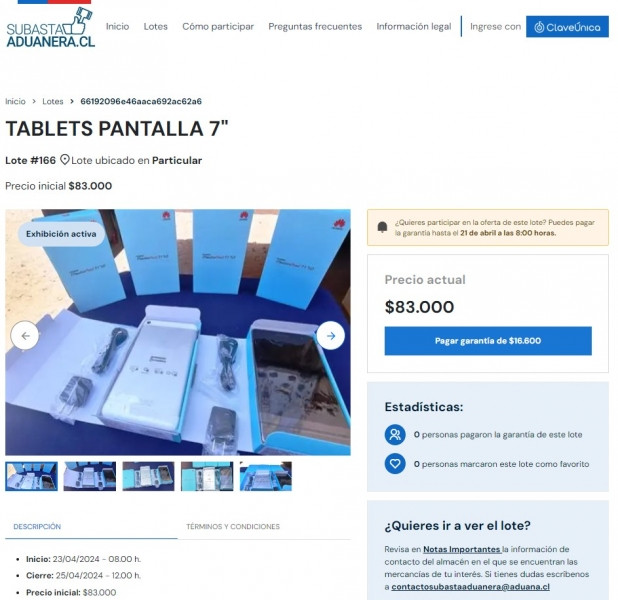Este viernes 12 de abril comienza el período de exhibición y pago de garantías (20% del valor de cada lote) de la primera Subasta Electrónica de Aduanas del 2024, el que se mantendrá hasta el domingo 21 de abril a las 8 AM. Le ejecución, es decir, el momento para hacer las pujas, es desde el martes 23 al jueves 25 abril en diferentes horarios de acuerdo al o los lotes escogidos. Todos los detalles y los lotes están disponibles en www.subastaaduanera.cl/lotes.