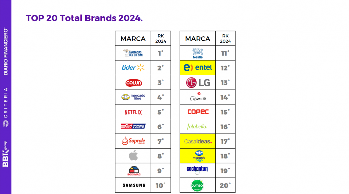 En la tercera edición del estudio Total Brands, desarrollado por BBK Group y Criteria, se midió nuevamente la vigencia con que son percibidas las marcas por parte de los consumidores, centrándose en investigar qué tan actuales, fuertes y conectadas con las personas están las compañías analizadas, lo que se evalúa a través de cuatro dimensiones diferentes: propuesta de valor, experiencia, identidad, y propósito.