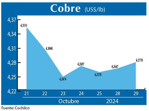 Un avance de 0,3% experimentó el precio del cobre este martes en la Bolsa de Metales de Londres (BML) al cerrar en US$ 4,277 la libra. La materia prima promedia US$ 4,160 la libra en lo que va del año con un alza de 7,5%.
