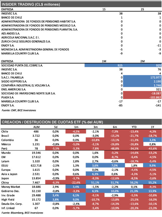En cuanto a ETF, durante la semana no se registraron variaciones en las cuotas del ETF chileno (ECH), mientras que se acumula una destrucción de cuotas de –13,4% en lo que va del año y una destrucción de cuotas de –4,3% durante los últimos 12 meses.