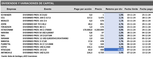 Entre las principales noticias de la semana: (1) Resultados Corporativos 3T24: Multi X, SQM y Aguas Andinas; y (2) Día del inversionista: CAP, Multi X, Enel Chile, Enel Américas.