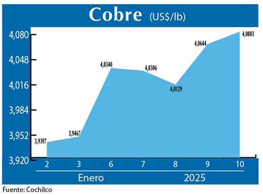 Un ascenso de 0,4% experimentó el precio del cobre este viernes en la Bolsa de Metales de Londres (BML) al cerrar en US$ 4,080 la libra. De esta forma, la materia prima promedia US$ 4,325 la libra en lo que va del año con un avance de 7,8%.