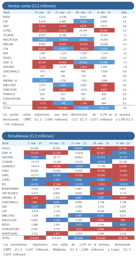 Acciones chilenas se muestran defensivas ante las fuertes correcciones observadas en mercados accionarios globales. La imposición de aranceles recíprocos de 10% por parte de Estados Unidos a Chile no incluyó en primera instancia al Cobre. En ese sentido, uno de los sectores que podría verse más impactado es el sector acuícola (Salmones), que representa el segundo mayor ítem exportado a Estados Unidos, con ~US$ 2.500 millones en 2024. Sin embargo, los efectos serían acotados ya que no existe mucho espacio para una sustitución por salmón Noruego, ya que Chile sigue presentando una importante ventaja competitiva por cercanía. Además, este año el sector acuícola presentará una importante mejora en resultados, principalmente por la disminución en los costos de alimentos, por lo que las perspectivas en general son auspiciosas para el sector. Por otro lado, el sector Eléctrico sería el menos afectado ya que es un sector dolarizado, que no presenta exposición al comercio internacional y tampoco una alta sensibilidad al ciclo económico.